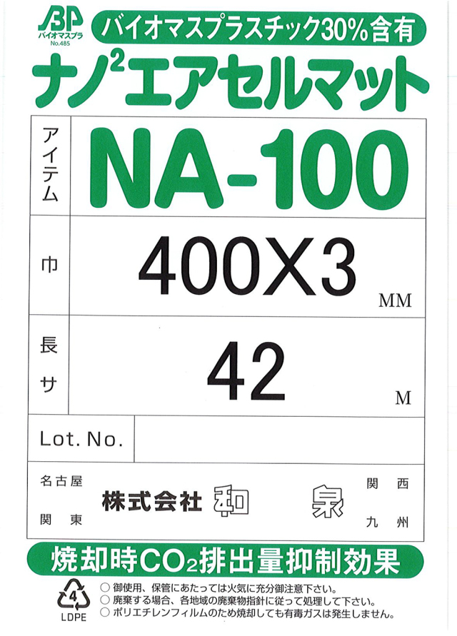 ナノエアを開発した(株)和泉ではバイオマス原料使用+軽量化+二酸化炭素削減=業界オンリーワンの環境対応気泡緩衝材で、地球環境の負荷低減に取り組んでいます。この度の仕様変更では地球環境への負荷を減らすべく従来のナノエアをさらに進化させています。